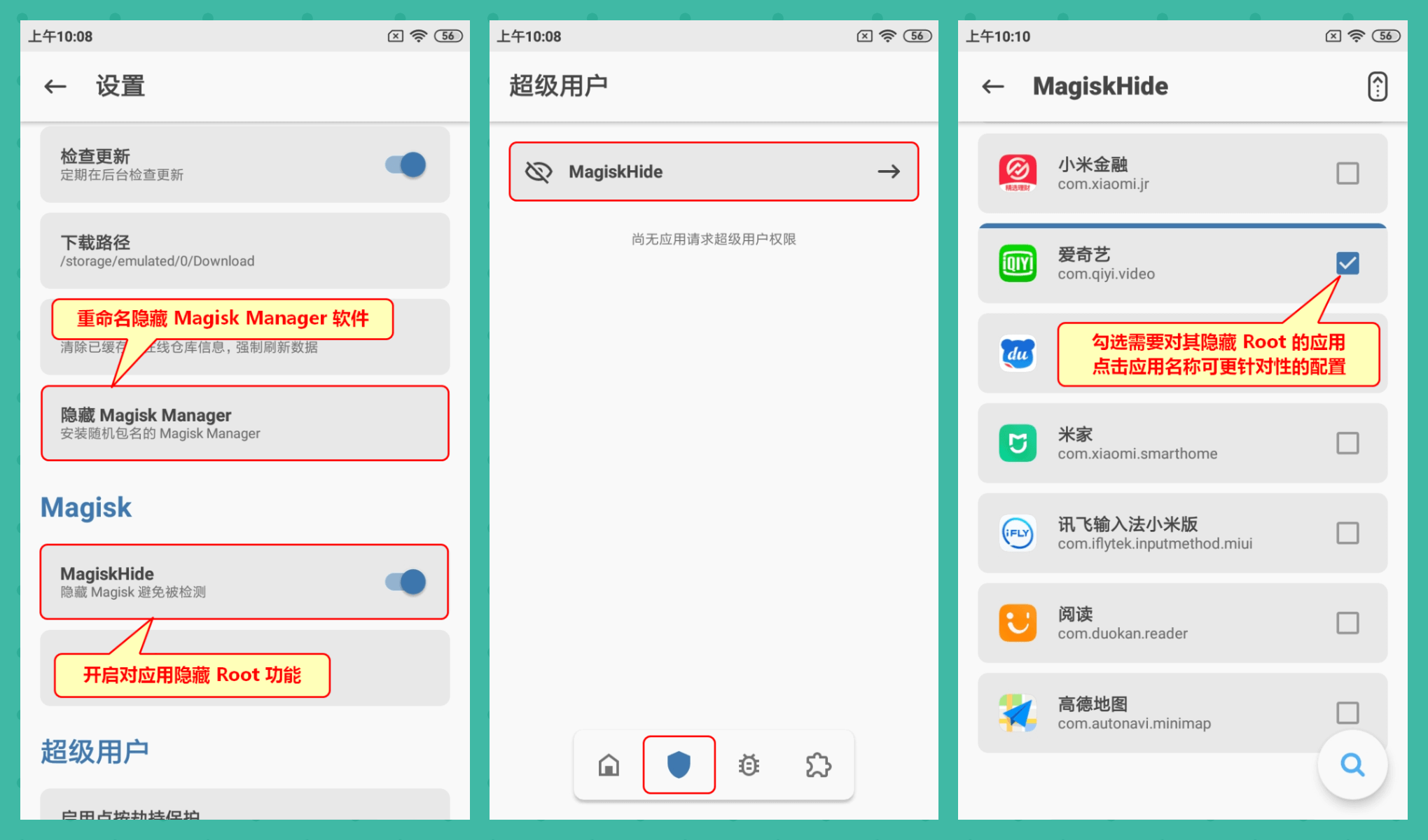 要解决这个问题,可以在 Magisk 里开启“MagiskHide”选项,然后在权限管理界面勾选需要对哪些应用隐藏 Root,具体步骤查看这个图解。
